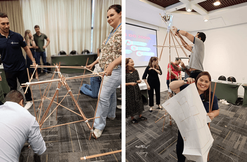 Team building vivencial que une colaboração e responsabilidade social. Através de uma construção coletiva, o time desenvolve gestão de tempo, processos e recursos, com entrega de excelência que gera orgulho real no resultado.